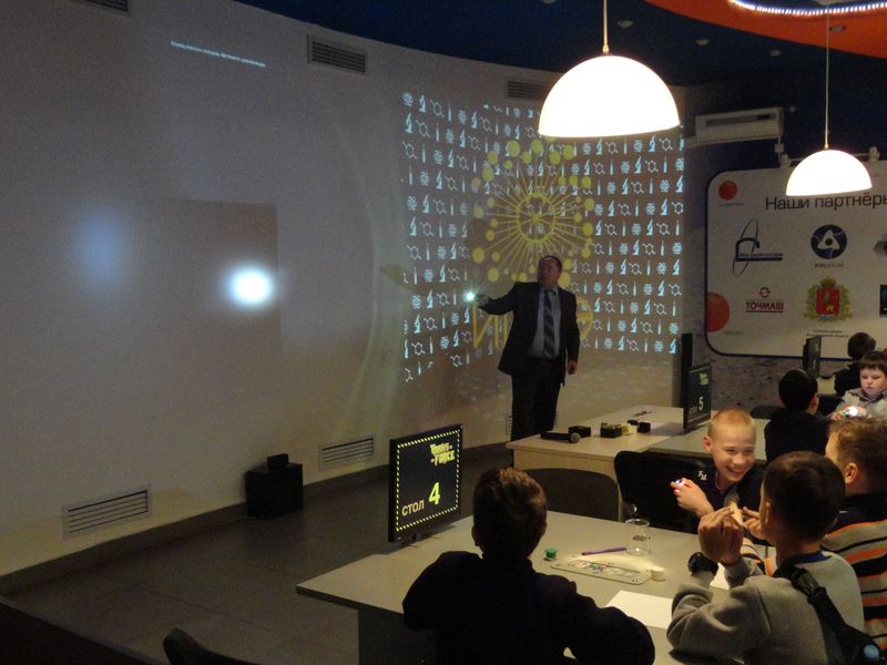 Помимо просмотра интерактивных программ, каждый день школьники участвовали в специальных проектах центра, посвящённых популяризации науки и технологий. Ученики школы № 1 города Владимира с удовольствием погрузились в роль юных исследователей на занятиях проекта «ФИКСИруй опыт». Пятиклассники из школы № 36 сделали первый шаг к изучению физики на занятии «Свет и тень», в наглядной и доступной форме рассказывающем о таких сложных явлениях, как дисперсия, дифракция и интерференция света. Ребята из школ № 2 и № 10 с удовольствием проверили свои знания в «Атомном ЧГК», почувствовав себя настоящими телевизионными знатоками. А студенты Владимирского авиамеханического колледжа в рамках мероприятий, приуроченных к 70-летию Победы в Великой Отечественной войне, и 70-летию атомной отрасли узнали о вкладе владимирских и ковровских предприятий в Великую Победу, посетив кинолекторий «Аты-баты: истории старого солдата».
